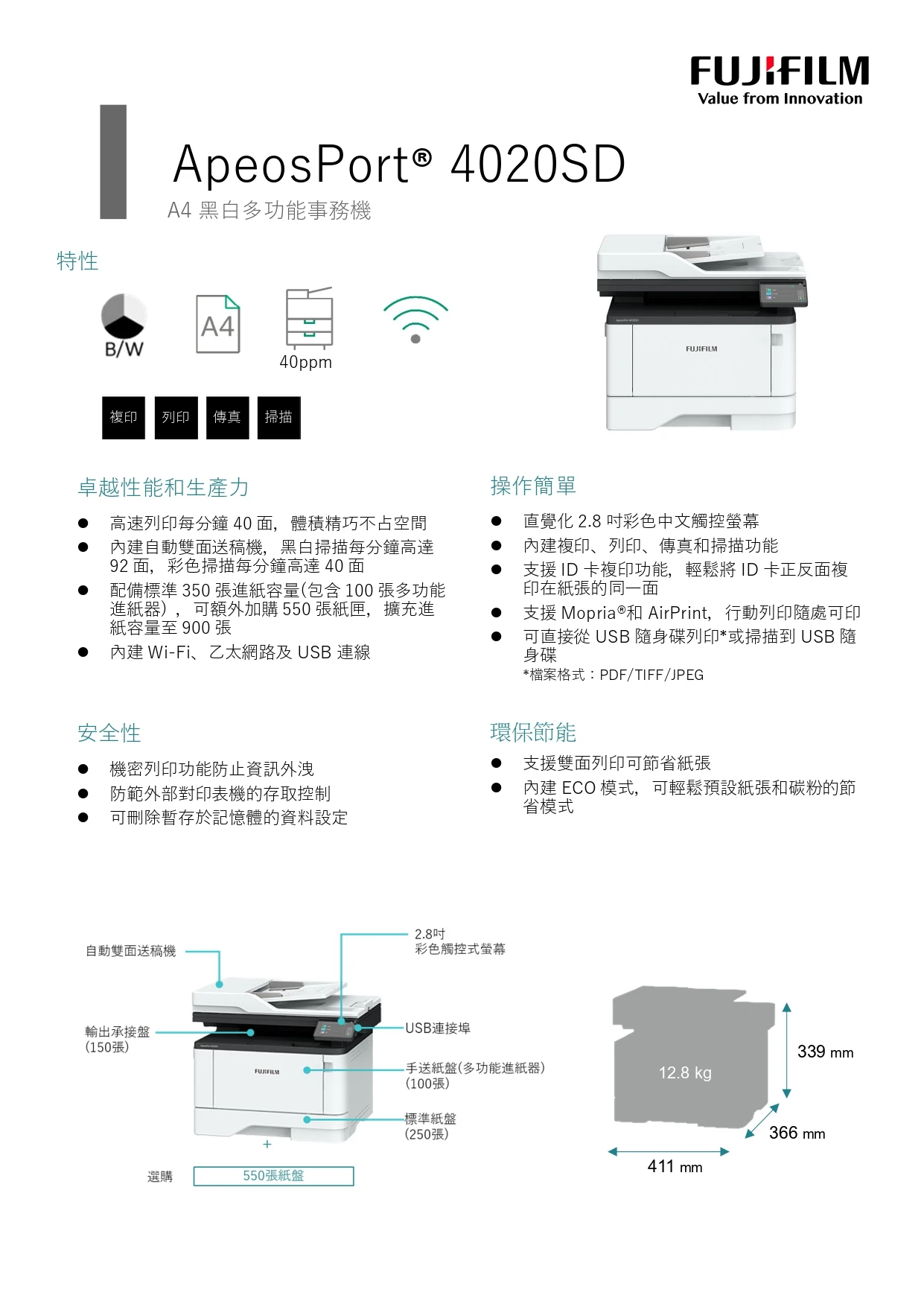 ●列印速度每分鐘達40面,首張列印時間最快僅需5.9秒