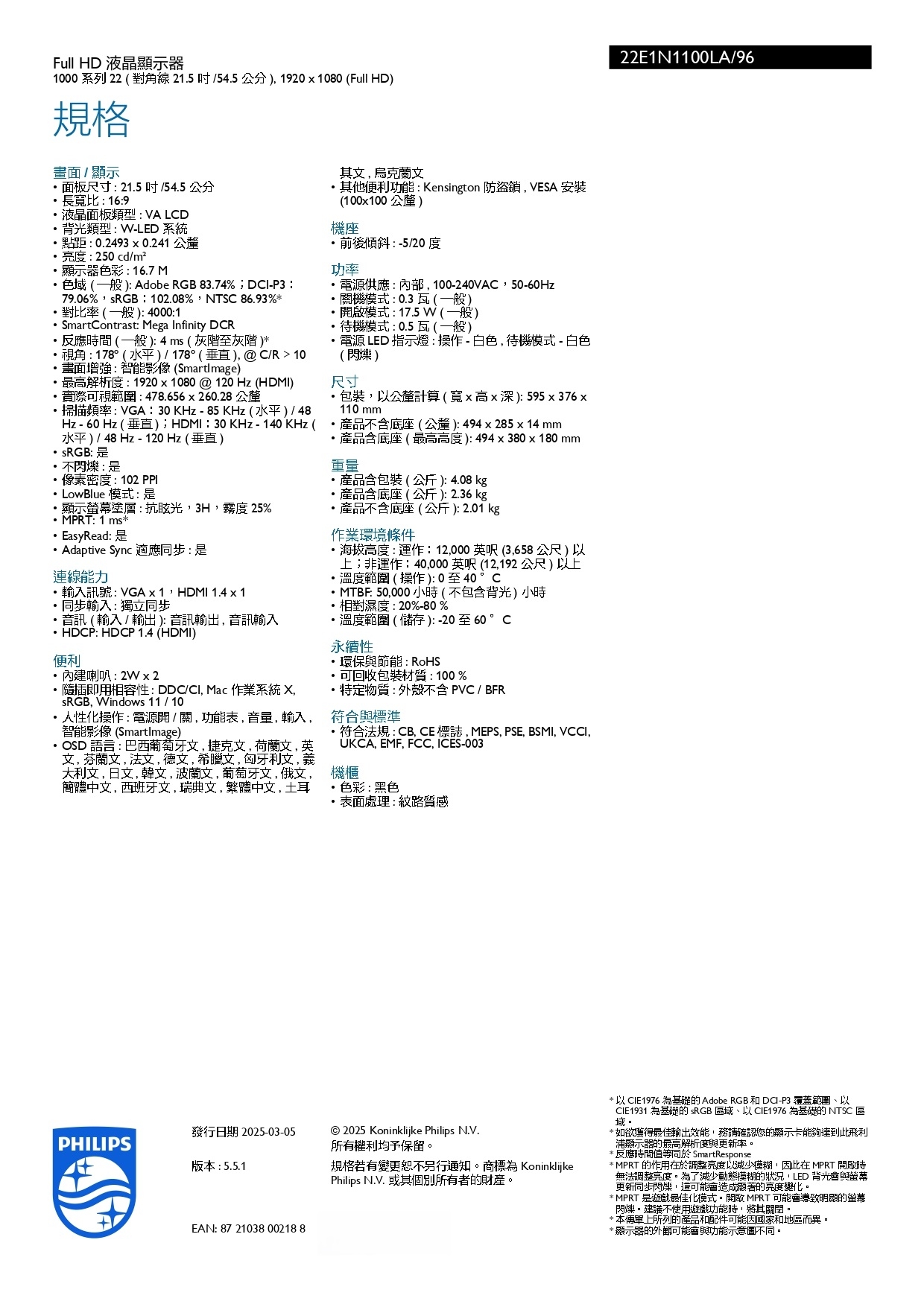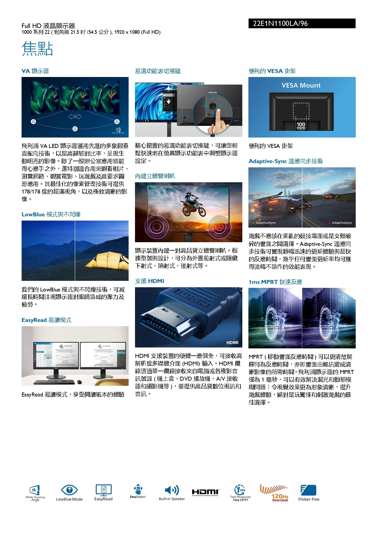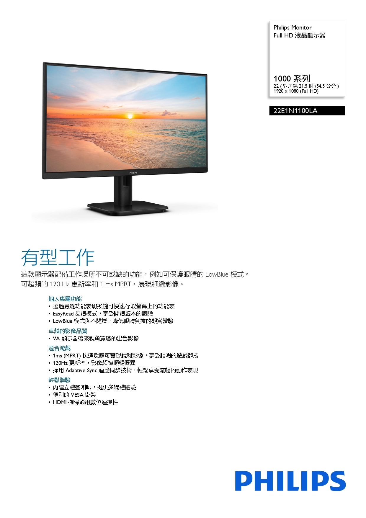 PHILIPS 飛利浦 22E1N1100LA 液晶螢幕(22型/120Hz/內建喇叭/VGA/HDMI/4ms/VA)