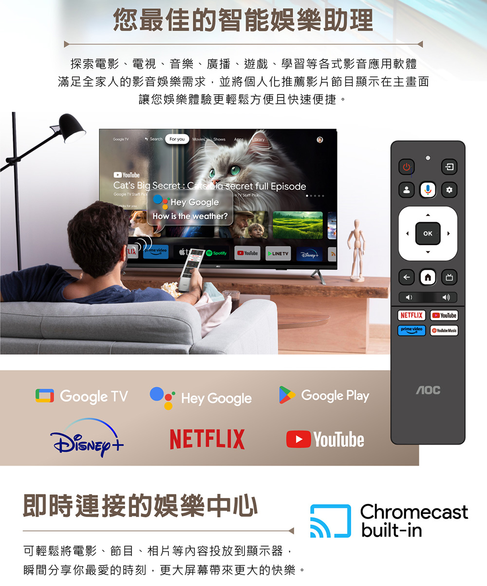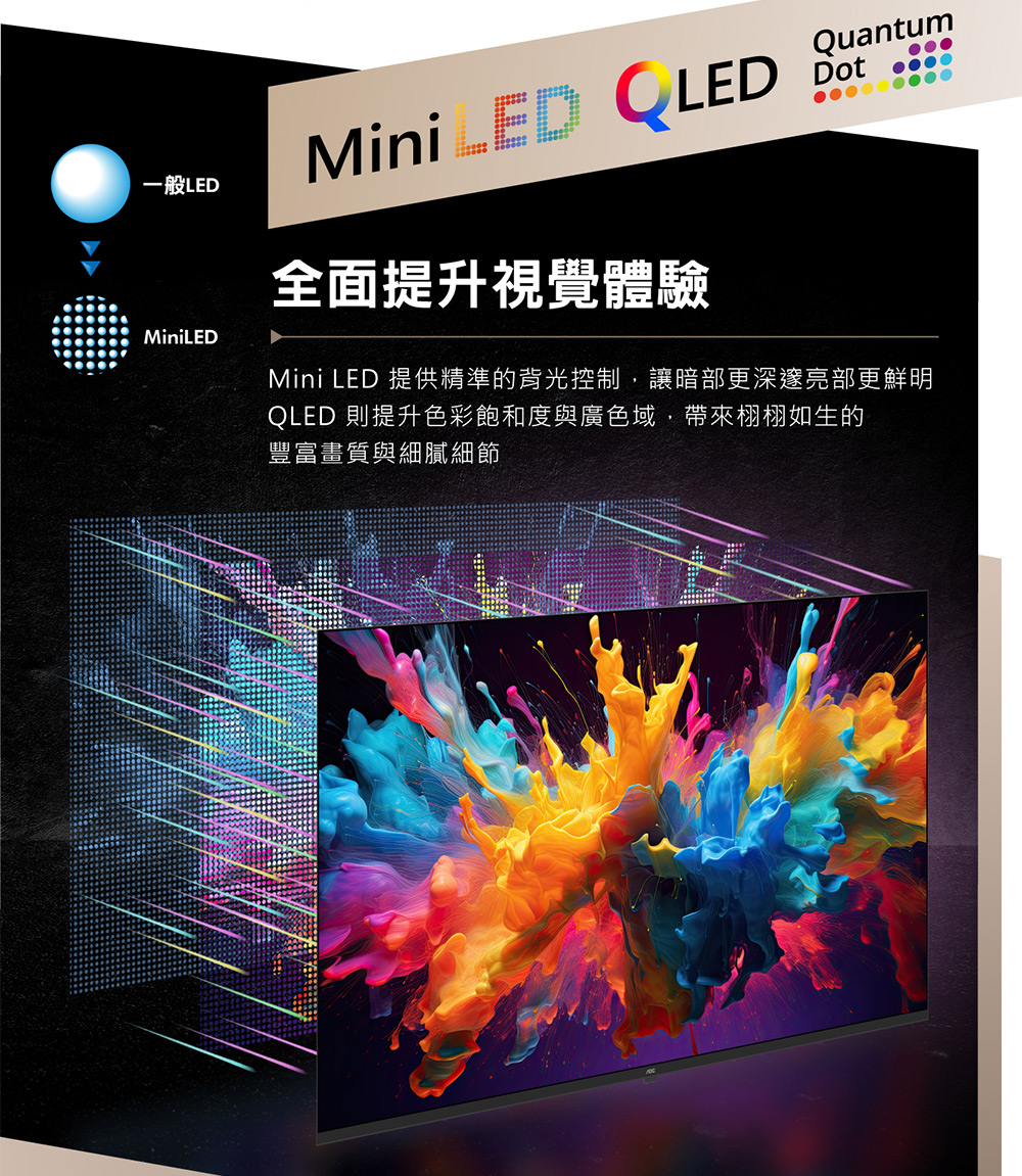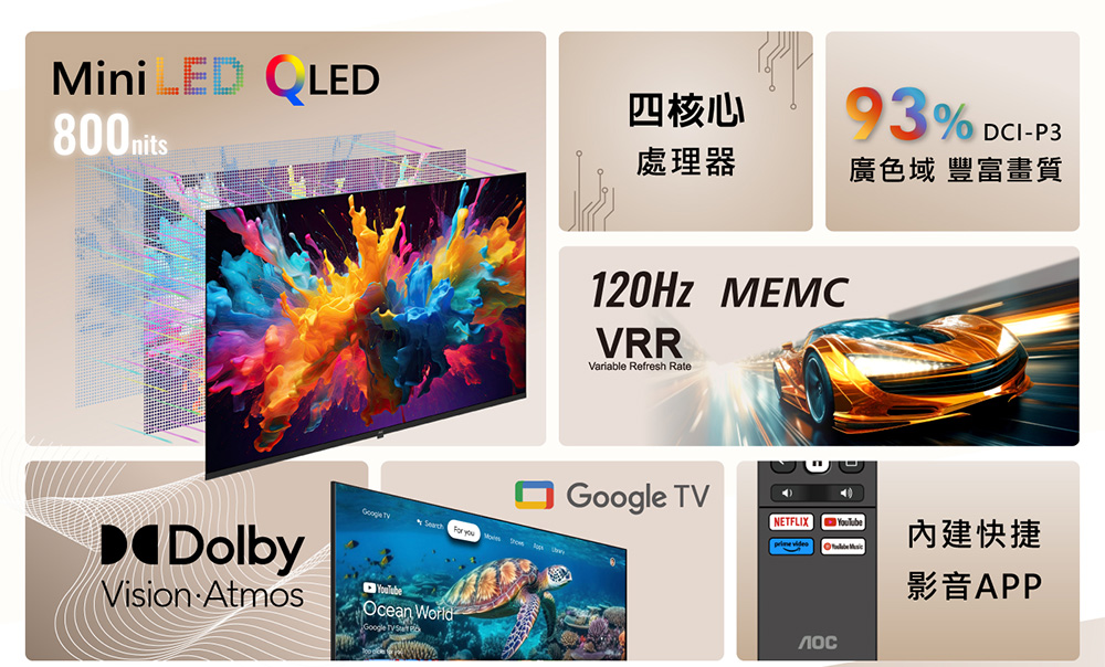 【出清】【不含安裝】AOC 55型 4K QD MiniLED 120Hz Google TV 量子點智慧顯示器(55U9340)-全新僅箱損