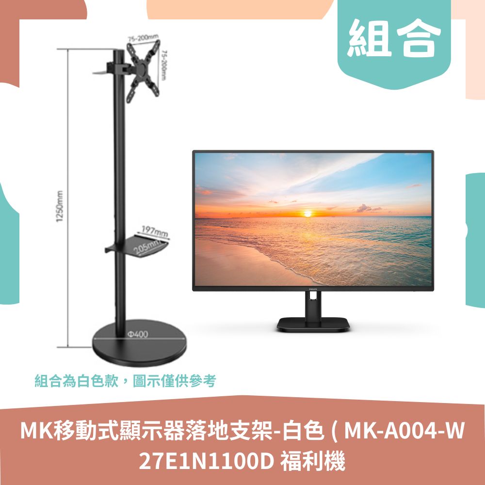 【生活組合包】YOUPIN MK移動式顯示器落地支架-白色 ( MK-A004-W )+PHILIPS 飛利浦 27E1N1100D 27型電腦螢幕 (低藍光/防閃屏/IPS)-福利品